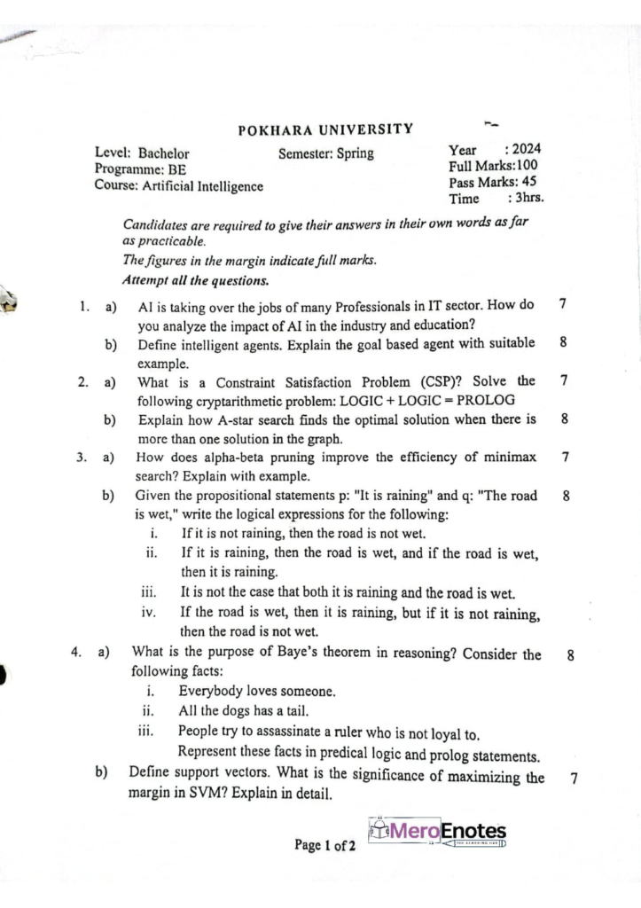 Here are the Pokhara University PU BE Computer Artificial Intelligence Question paper for the 5th Semester. This resource will help you practice efficiently. Build Confidence, and Perform better in your Exam. Here is the last 5 Year Question Paper Collection. If you need a PDF of this Question paper Contact us on Social Media We will provide you with the paper. If you have any subject Question papers share them with others through Mero Enotes.