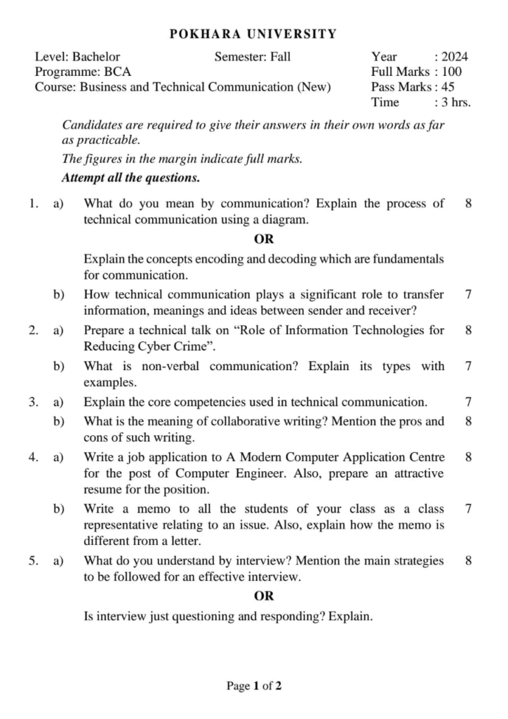 Here are the Pokhara University PU BCA Business and Technical Communication Question Paper 2nd Semester. This authentic resource will help you practice efficiently. Build Confidence, and Perform better in your Exam. Here is the last 5 Year Question Paper Collection. If you need a PDF of this Question paper Contact us on Social Media We will Provide you with the paper. If you have any subject Question papers share them with others through Mero Enotes
