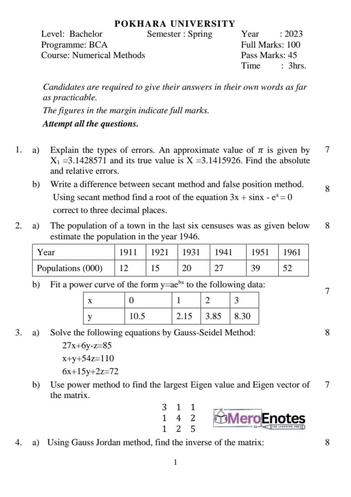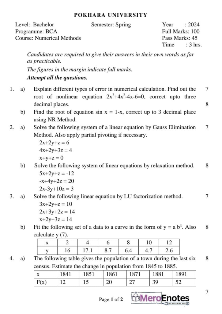 Here are the Pokhara University Pou BCA Numerical Methods Question Paper. This authentic resource will help you practice efficiently. Build Confidence, and Perform better in your Exam. Here is the last 5 Year Question Paper Collection. If you need a PDF of this Question paper Contact us on Social Media We will Provide you with the paper. If you have any subject Question papers share them with others through Mero Enotes.