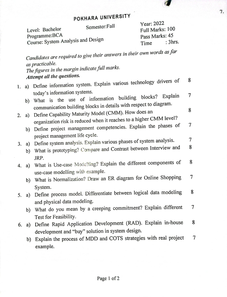 Here is the Pokhara University PU BCA SAD Question Paper 3rd Semester. This authentic resource will help you practice efficiently. Build Confidence, and Perform better in your Exam. Here is the last 5 Year Question Paper Collection. If you need a PDF of this Question paper Contact us on Social Media We will Provide you with the paper. If you have any subject Question papers share them with others through Mero Enotes.