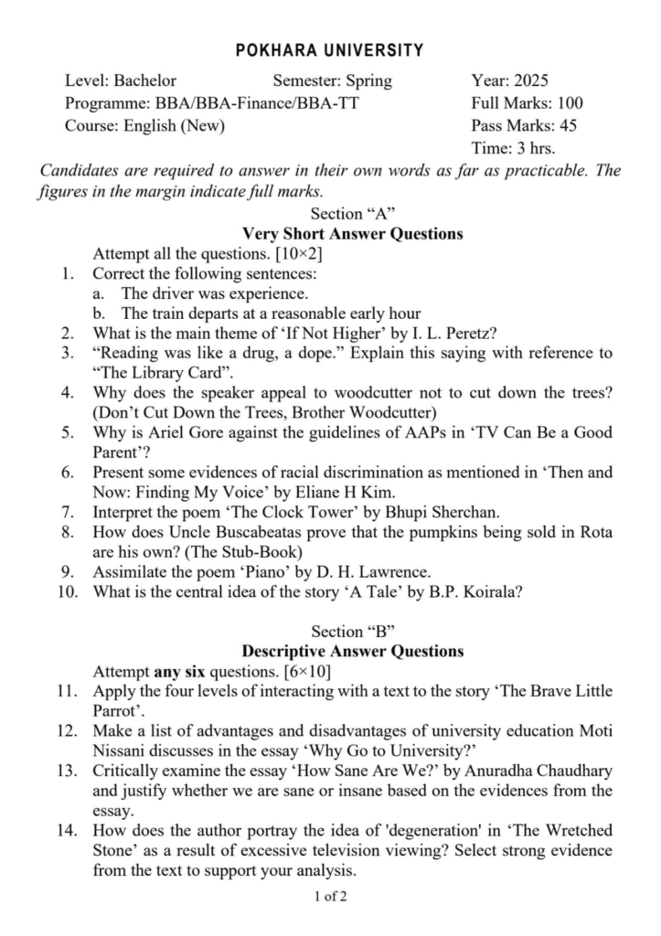 Here are the Pokhara University PU BBA BBA-IT BBA-BI BCIS BHCM BHM English Question Paper 1st Semester. This authentic resource will help you practice efficiently. Build Confidence, and Perform better in your Exam. Here is the last 5 Year Question Paper Collection. If you need a PDF of this Question paper Contact us on Social Media We will Provide you with the paper. If you have any subject Question papers share them with others through Mero Enotes.