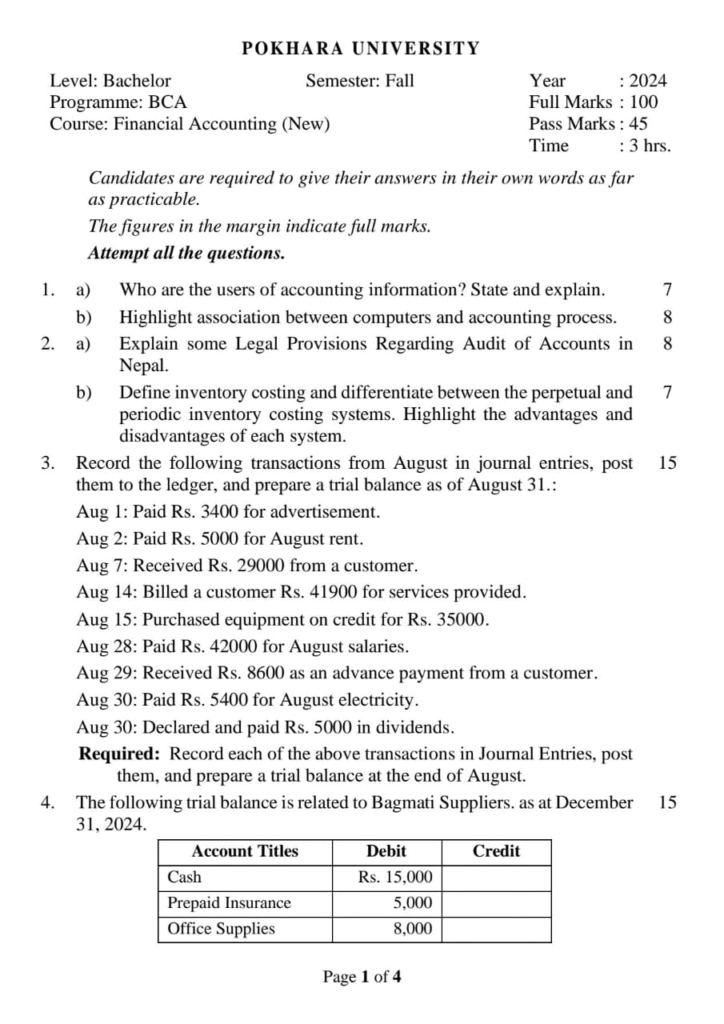 Here are the Pokhara University PU BCA Financial Accounting Question Paper 2nd Semester. This authentic resource will help you practice efficiently. Build Confidence, and Perform better in your Exam. Here is the last 5 Year Question Paper Collection. If you need a PDF of this Question paper Contact us on Social Media We will Provide you with the paper. If you have any subject Question papers share them with others through Mero Enotes.