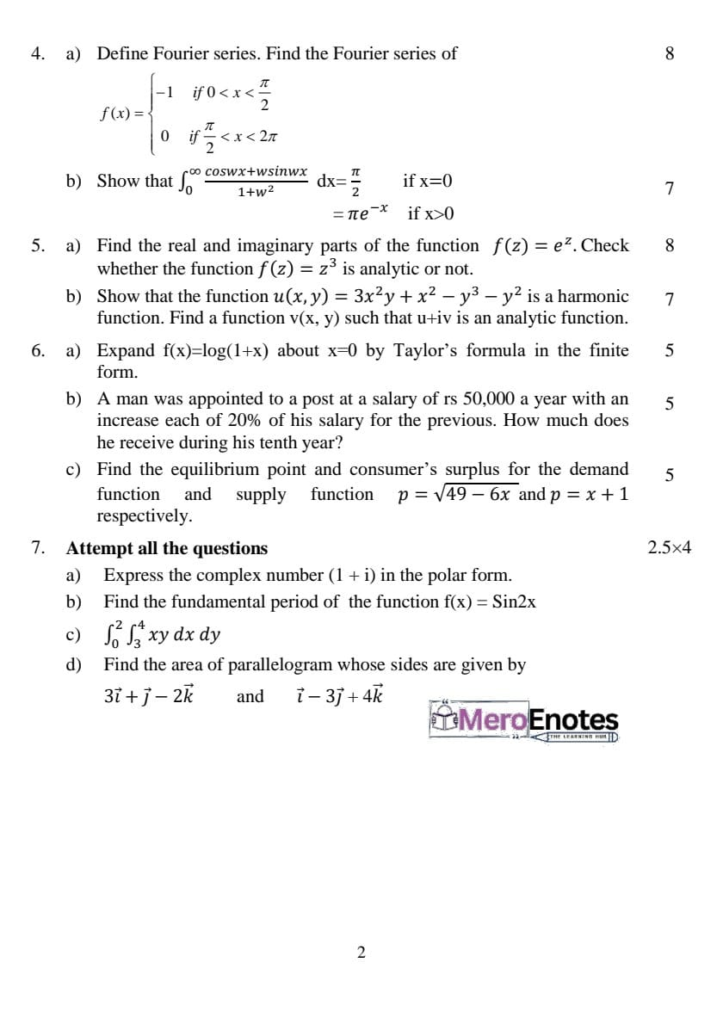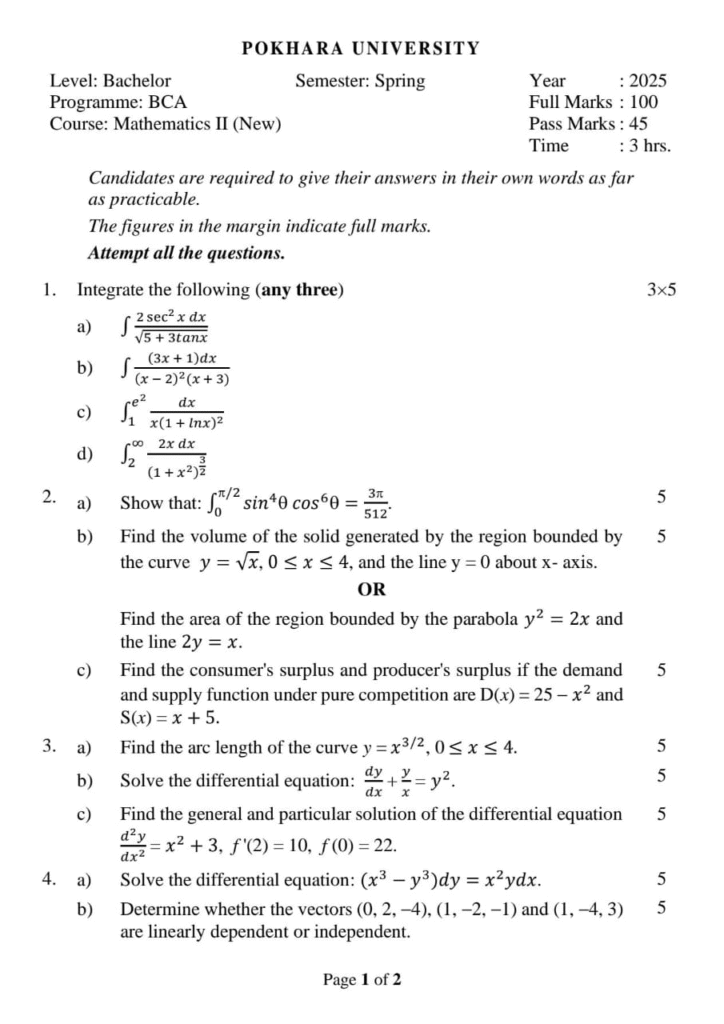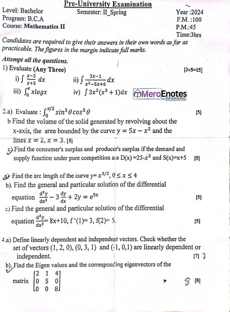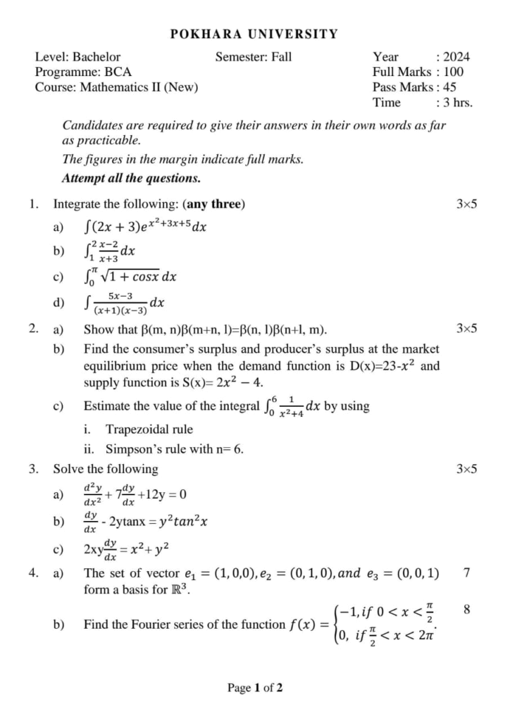Here are the Pokhara University PU BCA Mathematics II Question Paper 2nd Semester. This authentic resource will help you practice efficiently. Build Confidence, and Perform better in your Exam. Here is the last 5 Year Question Paper Collection. If you need a PDF of this Question paper Contact us on Social Media We will Provide you with the paper. If you have any subject Question papers share them with others through Mero Enotes.