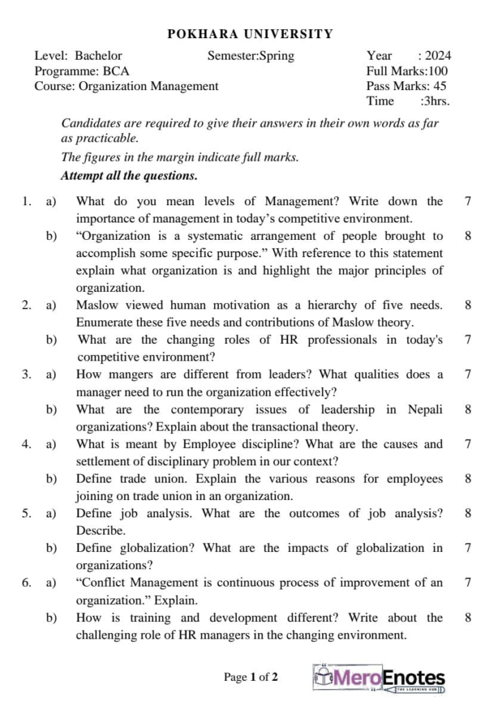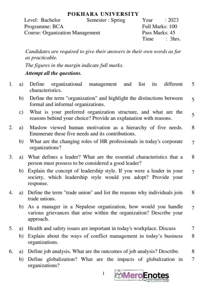 Here are the Pokhara University Pou BCA Organization & Management Question Paper 6th Semester. This authentic resource will help you practice efficiently. Build Confidence, and Perform better in your Exam. Here is the last 5 Year Question Paper Collection. If you need a PDF of this Question paper Contact us on Social Media We will Provide you with the paper. If you have any subject Question papers share them with others through Mero Enotes.
