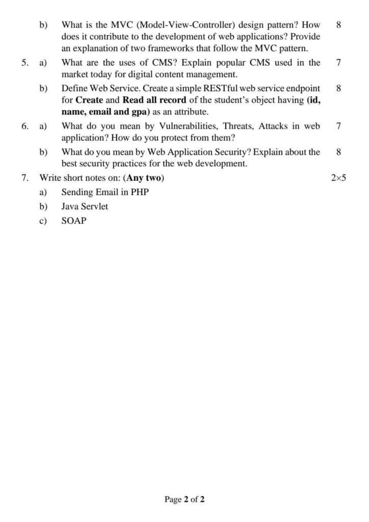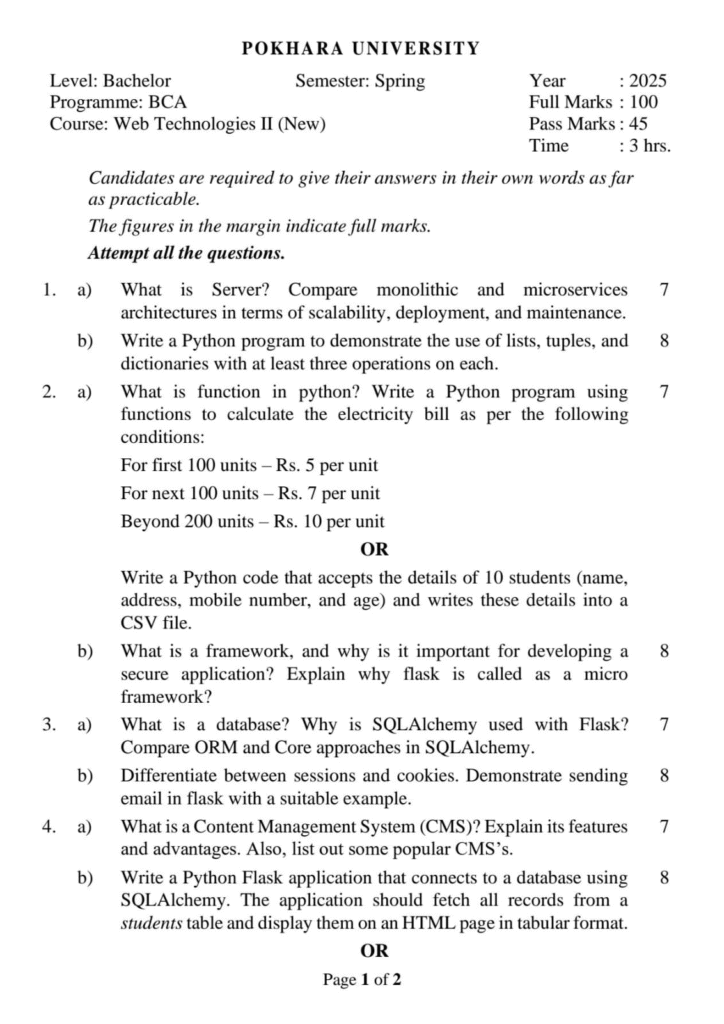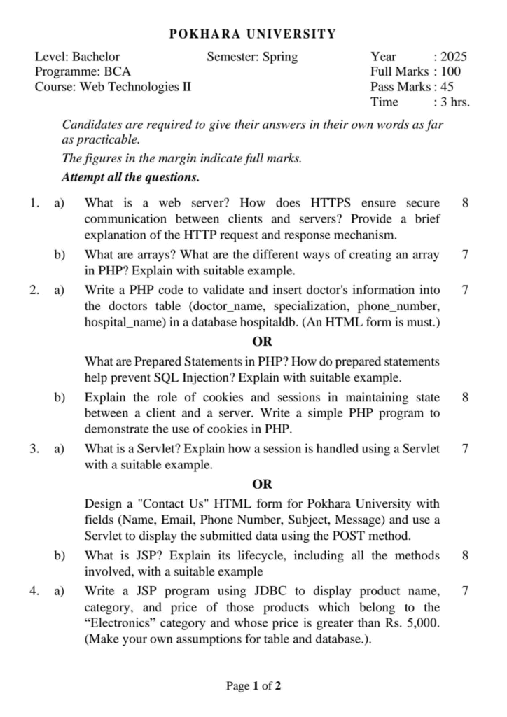 Here are the Pokhara University Pou BCA Web Technology II Question Paper 4th Semester. This authentic resource will help you practice efficiently. Build Confidence, and perform better in your Exam. Here is the last 5 Year Question Paper Collection. If you need a PDF of this Question paper Contact us on Social Media We will Provide you with the paper. If you have any subject Question papers share them with others through Mero Enotes.