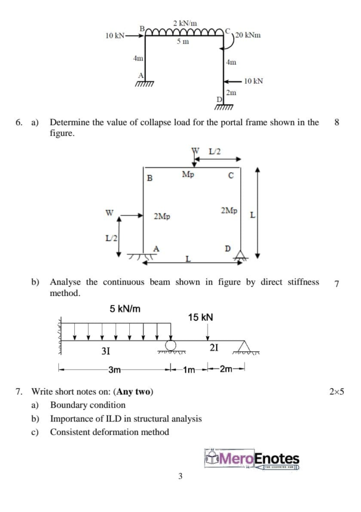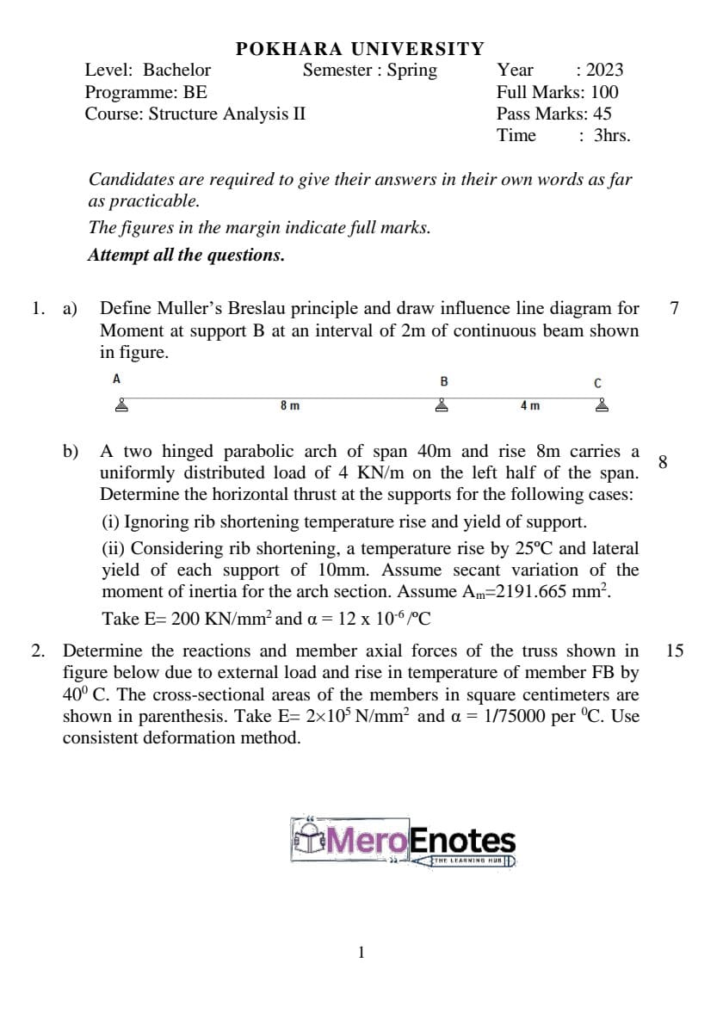Here is the Pokhara University PU BE Civil Structural Analysis II Question Paper for the 5th Semester. This resource will help you practice efficiently. Build Confidence, and Perform better in your Exam. Here is the last 5 Year Question Paper Collection. If you need a PDF of this Question paper Contact us on Social Media We will provide you with the paper. If you have any subject Question papers share them with others through Mero Enotes.