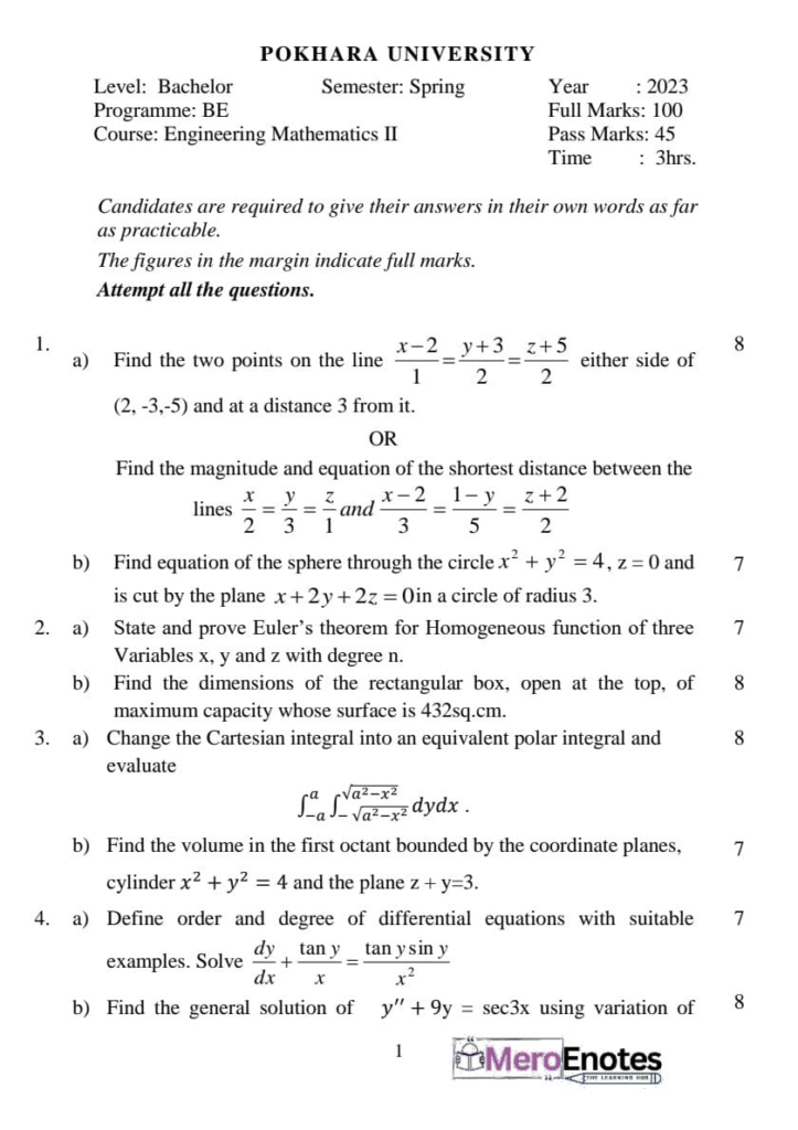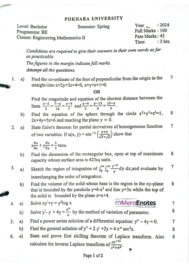 Here are the Pokhara University PU BE Civil Engineering Mathematics II Question Paper 2nd Semester. This authentic resource will help you practice efficiently. Build Confidence, and Perform better in your Exam. Here is the last 5 Year Question Paper Collection. If you need a PDF of this Question paper Contact us on Social Media We will Provide you with the paper. If you have any subject Question papers share them with others through Mero Enotes.