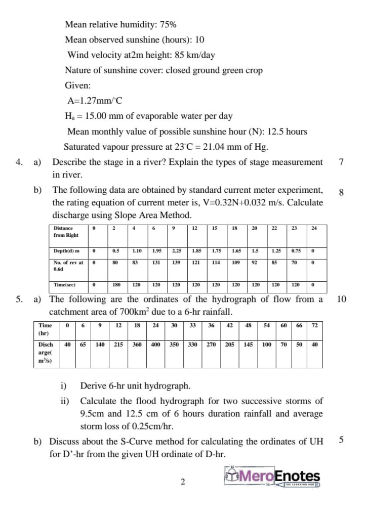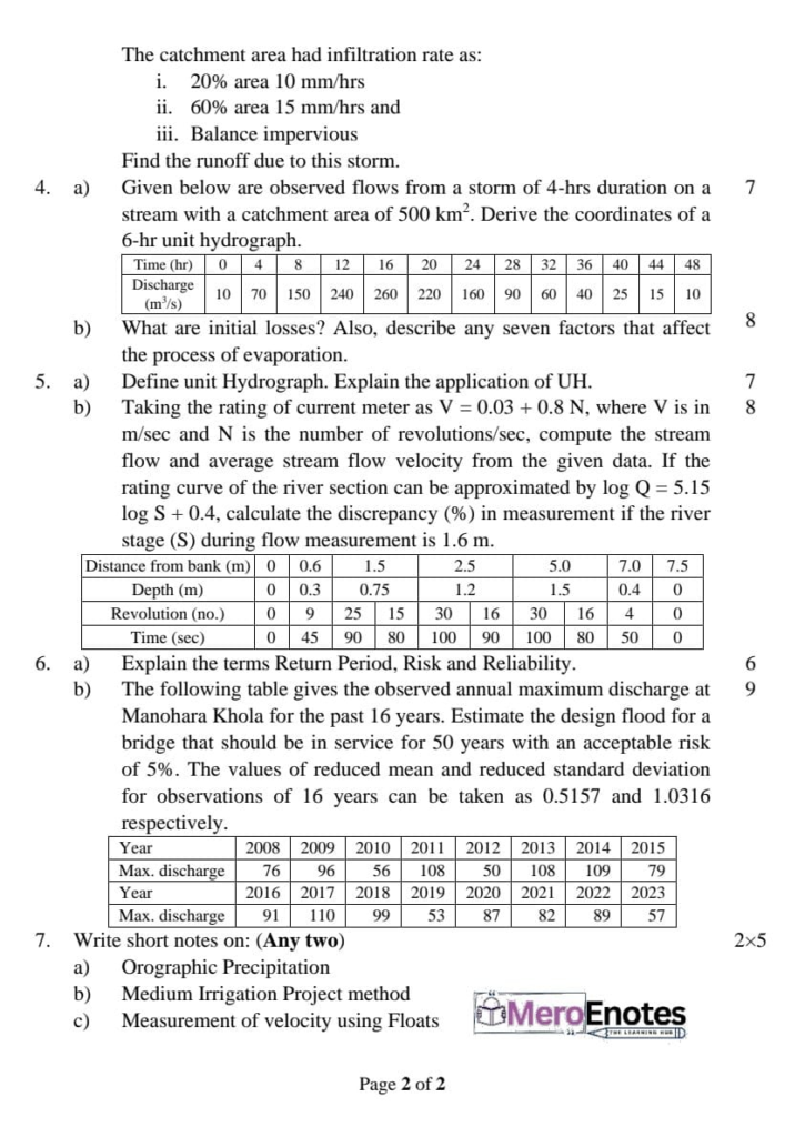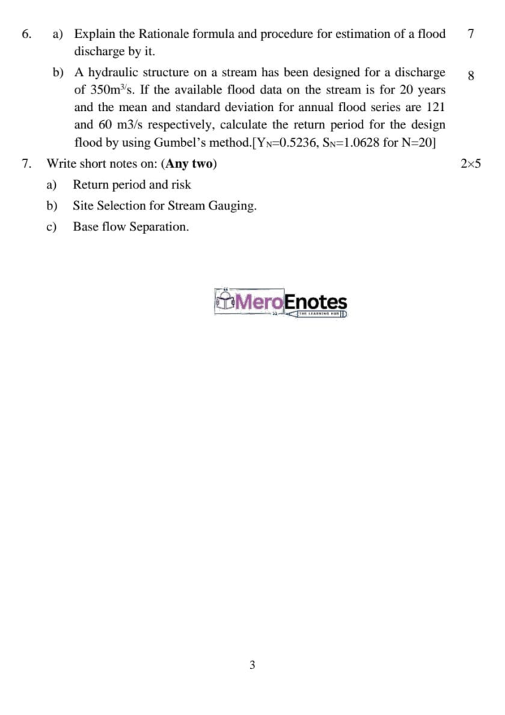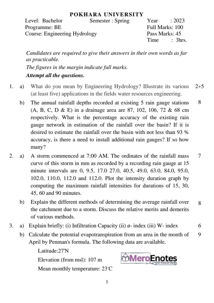 Here is the Pokhara University PU BE Civil Engineering Hydrology Question Paper for the 5th Semester. This resource will help you practice efficiently. Build Confidence, and Perform better in your Exam. Here is the last 5 Year Question Paper Collection. If you need a PDF of this Question paper Contact us on Social Media We will provide you with the paper. If you have any subject Question papers share them with others through Mero Enotes.