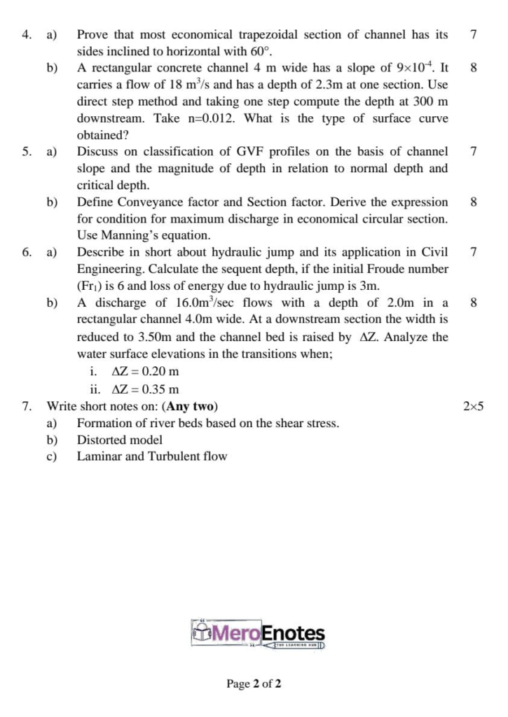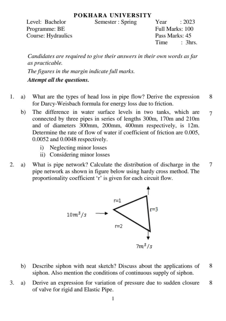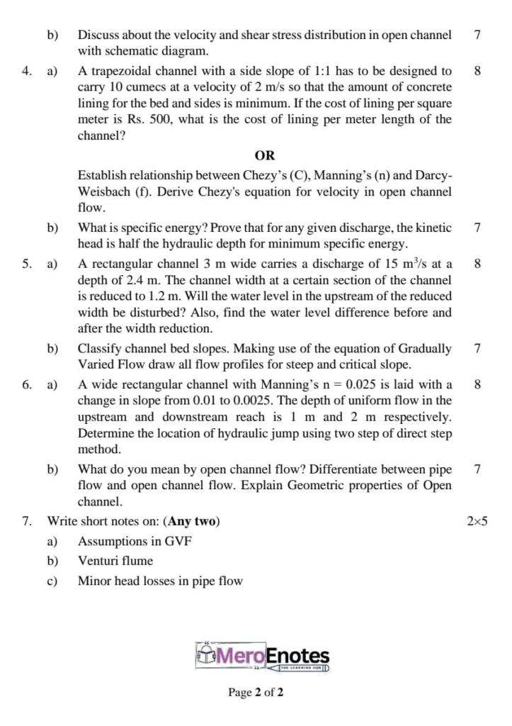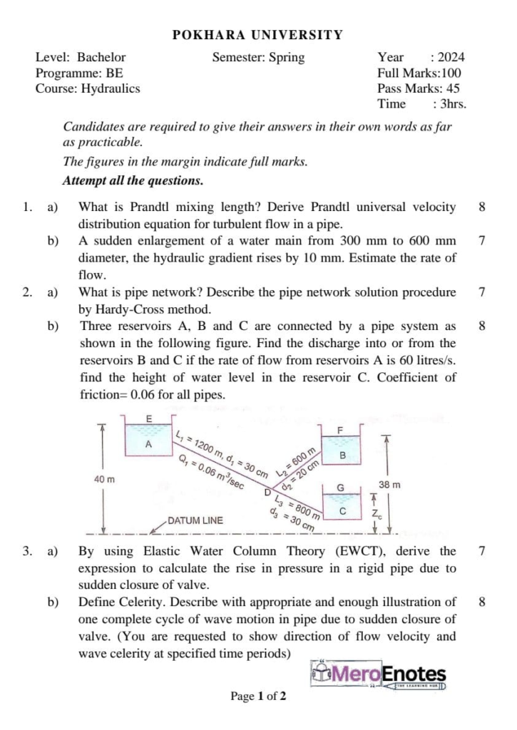 Here is the Pokhara University PU BE Civil Hydraulics Question Paper for the 4th Semester. This resource will help you practice efficiently. Build Confidence, and Perform better in your Exam. Here is the last 5 Year Question Paper Collection. If you need a PDF of this Question paper Contact us on Social Media We will provide you with the paper. If you have any subject Question papers share them with others through Mero Enotes.
