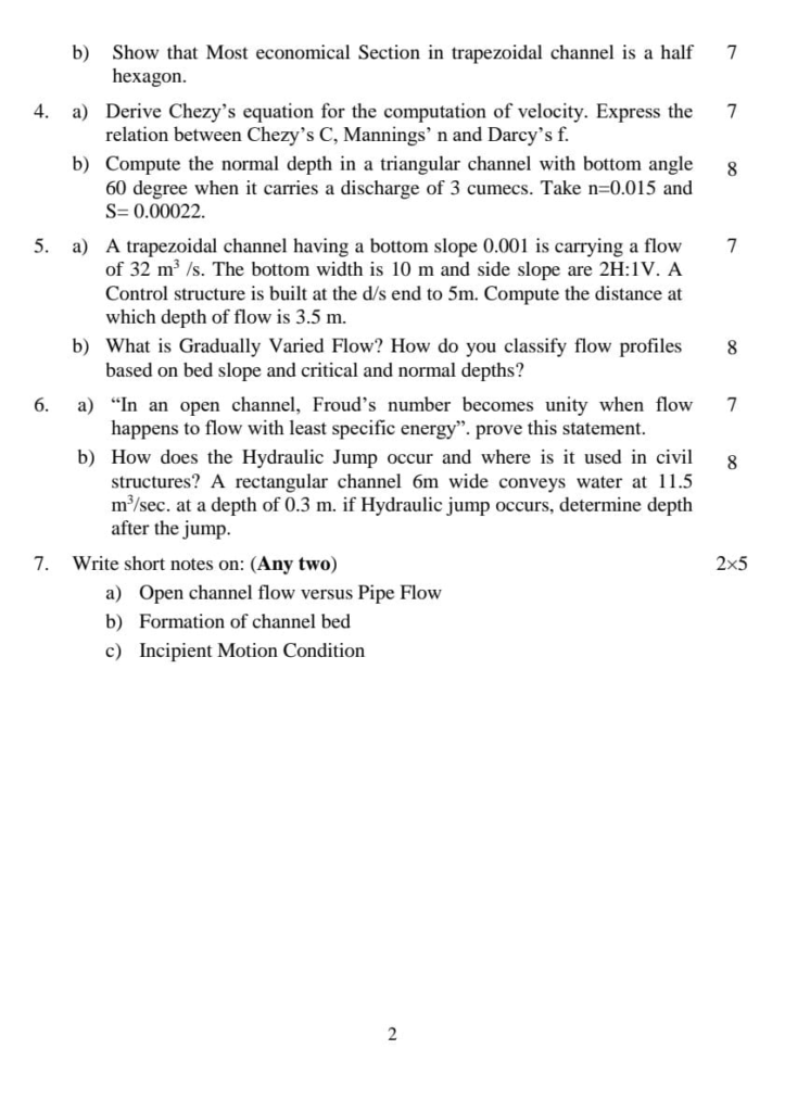 BE Civil Hydraulics Question Paper 2023