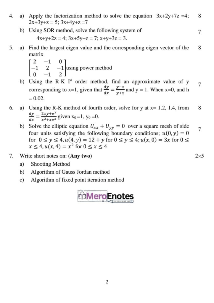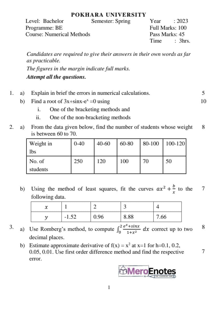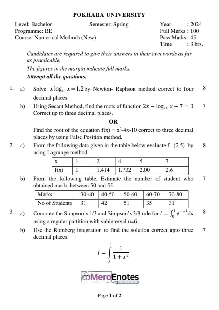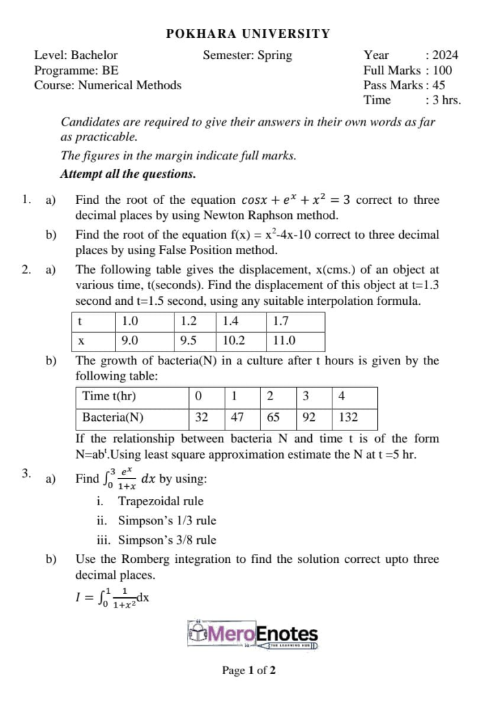 Here is the Pokhara University PU BE Civil Numerical Methods Question Paper for the 4th Semester. This resource will help you practice efficiently. Build Confidence, and Perform better in your Exam. Here is the last 5 Year Question Paper Collection. If you need a PDF of this Question paper Contact us on Social Media We will provide you with the paper. If you have any subject Question papers share them with others through Mero Enotes.