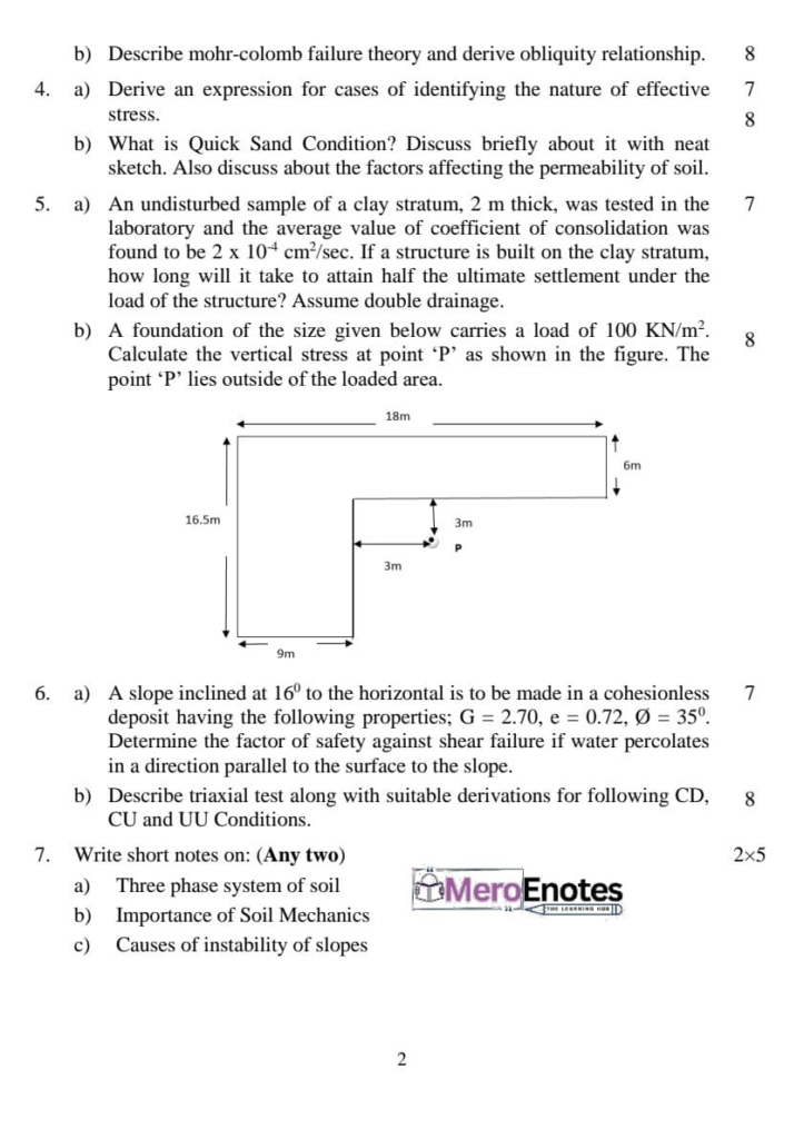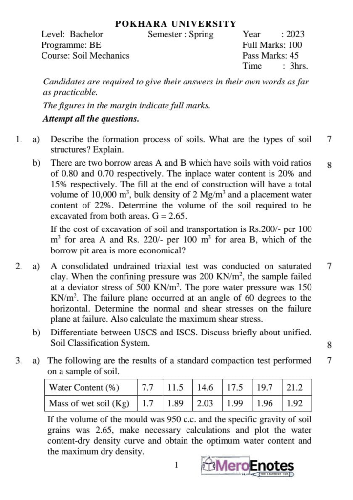 Here is the Pokhara University PU BE Civil Soil Mechanics Question Paper for the 5th Semester. This resource will help you practice efficiently. Build Confidence, and Perform better in your Exam. Here is the last 5 Year Question Paper Collection. If you need a PDF of this Question paper Contact us on Social Media We will provide you with the paper. If you have any subject Question papers share them with others through Mero Enotes.