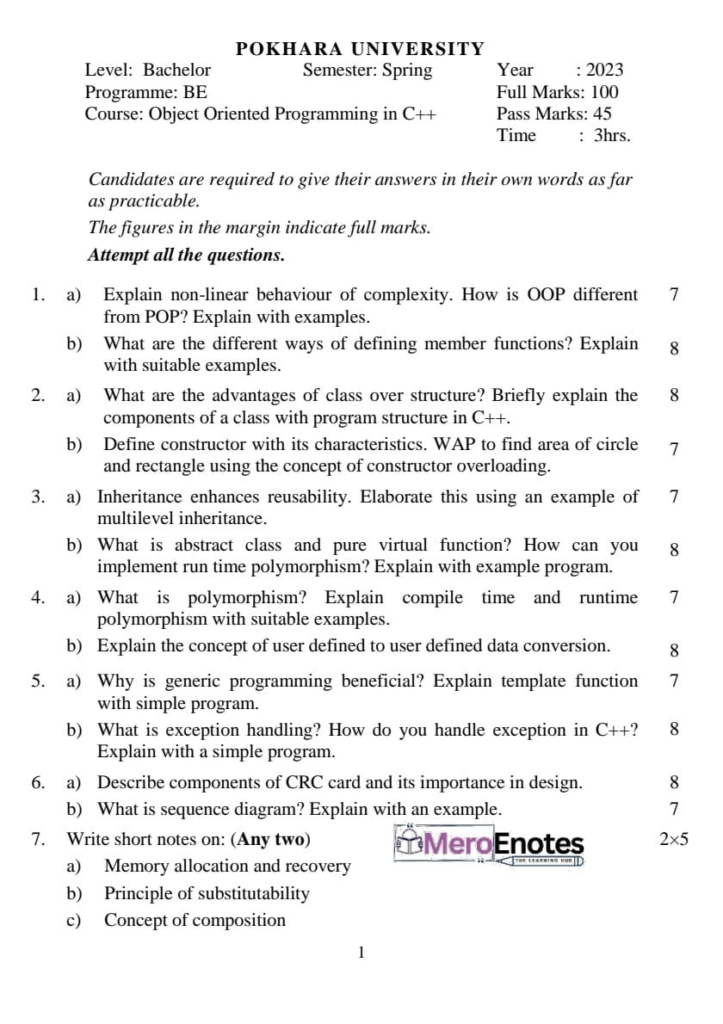 Here are the Pokhara University PU BE Computer OOPs C++ Question Paper 2nd Semester. This authentic resource will help you practice efficiently. Build Confidence, and Perform better in your Exam. Here is the last 5 Year Question Paper Collection. If you need a PDF of this Question paper Contact us on Social Media We will Provide you with the paper. If you have any subject Question papers share them with others through Mero Enotes.